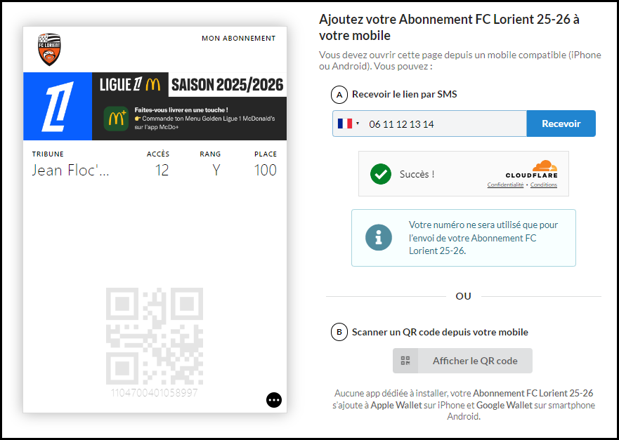 Renseignez votre numéro de téléphone pour recevoir le lien par SMS afin d'ajouter votre e-carte abonné dans le wallet.